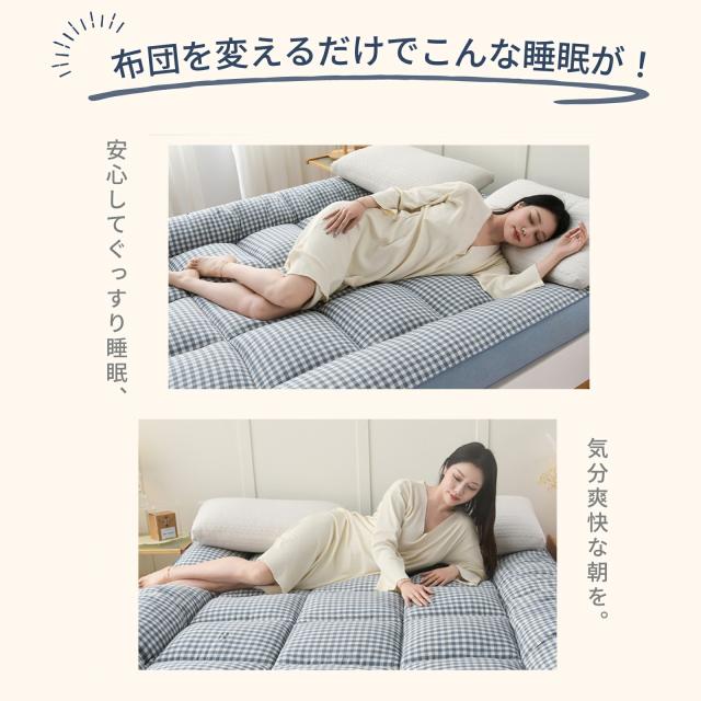 - とてもコンパクトになって届きましたが開けてみるとみるみるフワフワなお布団になりました。程よく厚みもあり腰も痛くなく、ぐっすりと寝ることが出来ました。購入して良かったです。