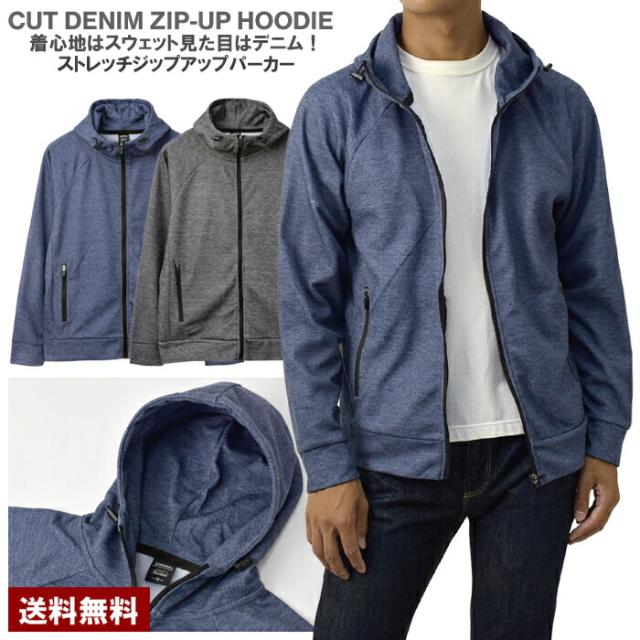 パーカー 長袖 メンズ ジップアップ デニム調 ファスナーポケット ストレッチ カットデニム フード 羽織り【C7K】【パケ1】【A】