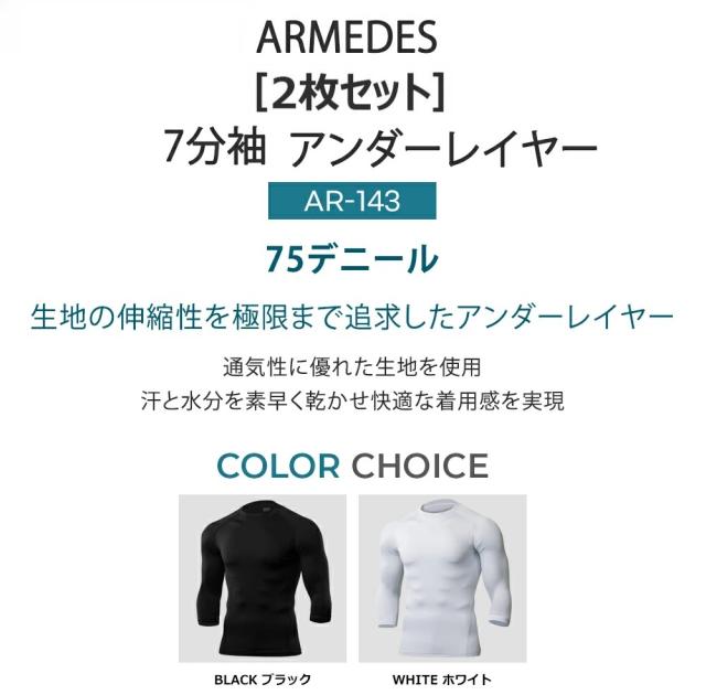 【ARMEDES】 アルメデス コンプレッションインナー 7分袖インナー 2枚セット ムーブフィット クールネック オールシーズン メンズ 長袖 工場MRO 病院 介護現場 調理場 UVカット 吸汗速乾 通気性 伸縮性 速乾性 送料無料 M-2XL ホワイト ブラック 全2色 AR143