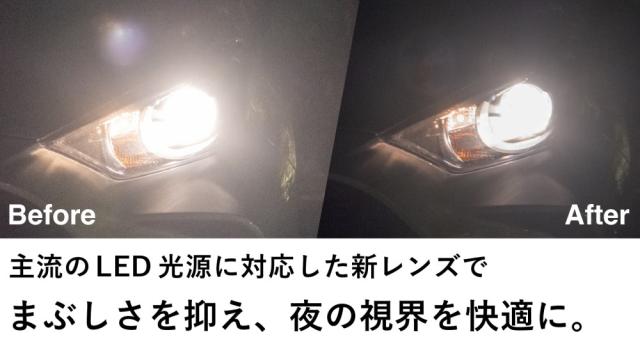 1)主流となったLED光源に対応。ヘッドライトの眩しさを抑えて、夜の視界を快適に。