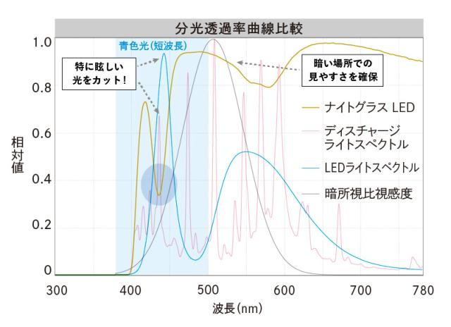対向車のライトのまぶしい光を抑えつつ、運転に必要な視界の明るさをしっかり と確保暗闇で最も明るさを感じる、510nm付近の光を十分に透過させるレンズを開発し、視界を暗くせずに眩しさを抑えることに成功。