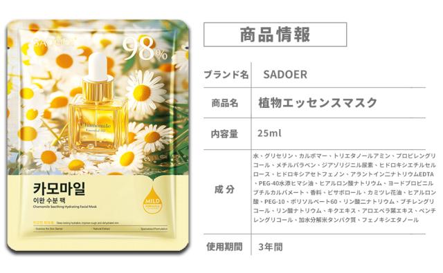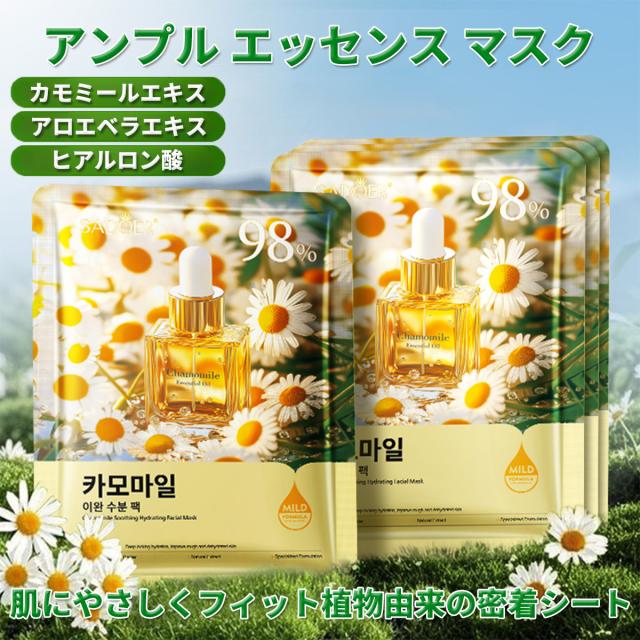 [10枚セット]アンプル エッセンス マスク 大容量、フェイスパック 個包装【カモミールエキス】活性成分配合、 鎮静パック、デイリーパック、美容マスク、極薄シルク生地、肌にやさしい密着シート、角質ケア 顔、毎日パック10枚入り