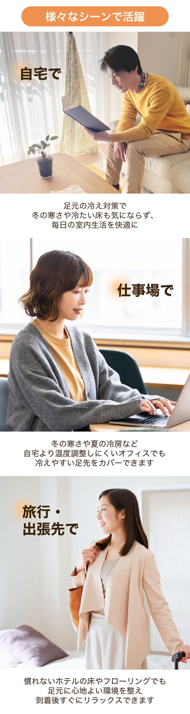 室内ならどこでも使える汎用性。くつろぎから家事、立ち仕事まで幅広く対応します。