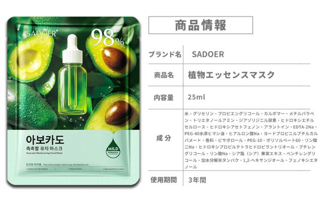 [10枚セット]アンプル エッセンス マスク 大容量、フェイスパック 個包装【アボカドエキス】活性成分配合、鎮静パック、ビタミン パック、美容マスク、デイリーパック、極薄シルク生地、ピタッと密着、角質ケア 顔、毎日パック10枚入り