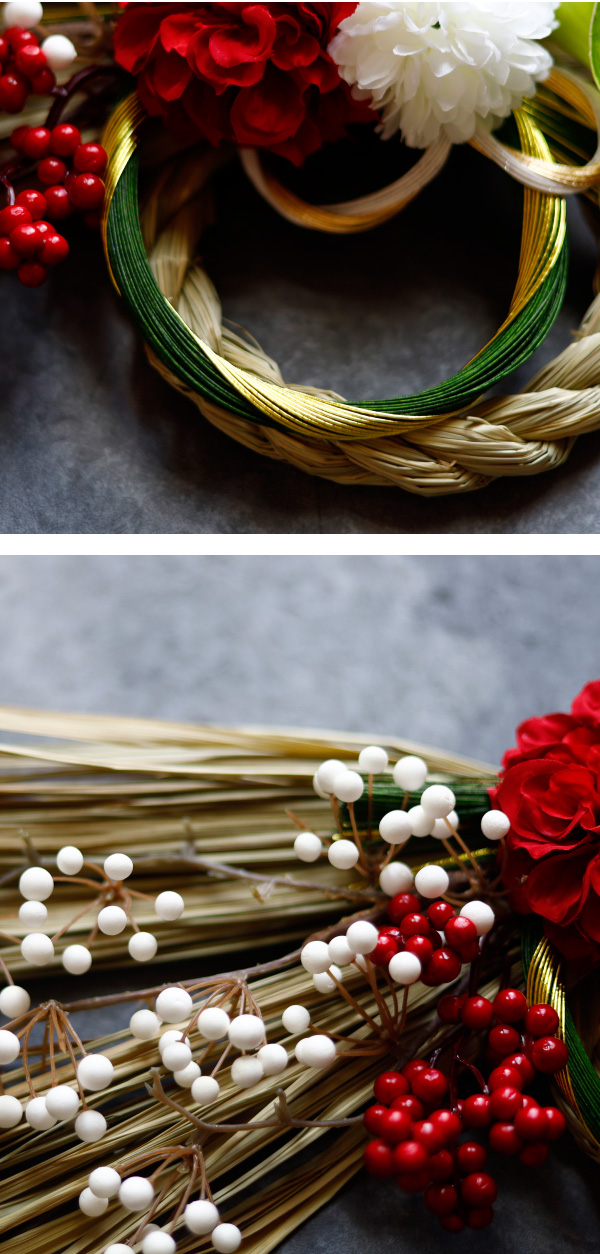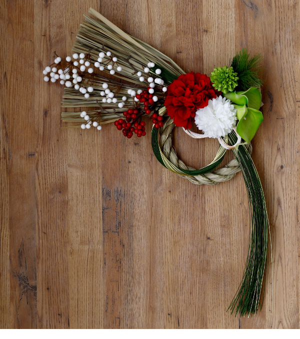 すべての素材が調和し、“幸福がめぐる一年”を願うしめ縄です。