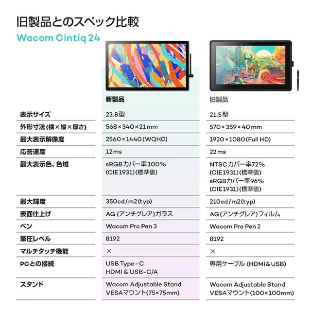 Wacom Cintiq 24 (DTK246) DTK246K4C Wacom Cintiq24 は、プロフェッショナル向けモデルで好評の Wacom Pro Pen 3 を搭載した液晶ペンタブレットです。 優れた追従性のペンに加え、2.5Kの解像度ディスプレイと画面への映り込みを軽減するアンチグレア加工により、 広々とした作業領域でまるで紙に描くような自然な描き心地を実現します。 ■表示サイズ 23.8型 ■外形寸法(横×縦×厚さ) 568×340×21mm ■最大表示解像度 2560×1440 (WQHD) ■応答速度 12 ms ■最大表示色、色域 sRGBカバー率100% (CIE 1931)(標準値) ■最大輝度 350cd/m2 (typ) ■表面仕上げ AG (アンチグレア) ガラス ■ペン Wacom Pro Pen 3 ■筆圧レベル 8192 ■マルチタッチ機能 × ■PCとの接続 USB Type-C HDMI & USB-C/A ■スタンド Wacom Adjustable Stand VESAマウント (75×75mm) ※記載は商品仕様の一部です。仕様説明不足等の理由での返品はできません。特に適合等は必ずご確認ください。