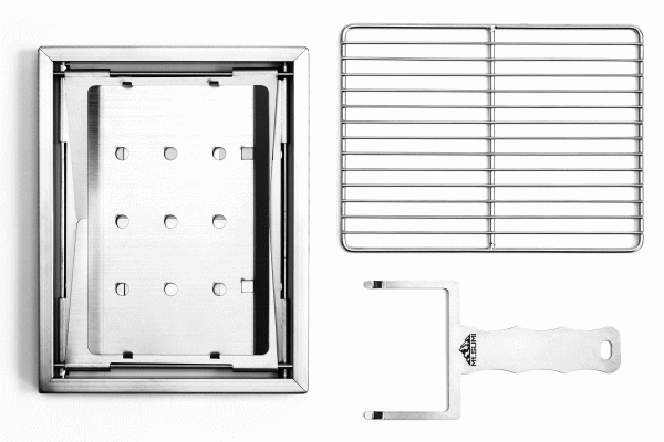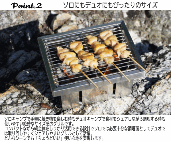 Mt.SUMI人気製品、組み立て・収納時間1秒のパーフェクトグリルシリーズに新製品が登場。本体をひっくり返すだけで驚くほどスピーディーに組み立てと撤収が可能です。グリルとしての使用はもちろんスキレットやダッチオーブンにも対応する堅牢な設計。それでいて折りたたむと高さはわずか2cm。まさにパーフェクトなグリルです。ソロキャンプで手軽に焼き物を楽しむ時もデュオキャンプで食材をシェアしながら調理する時も使いやすい絶妙なサイズ感のグリルです。どんなシーンでも「ちょうどいい」使い心地を実現します。付属のリフターを使用することでロストルの高さを3段階に調整できる設計になっており火加減を自在にコントロール可能です。調理内容や使用する器具に合わせて最適な高さに調整できるため炭火料理の幅が広がります■品番OS25FWPG-MI-SE■サイズ[展開時]W21.5×D16.5×H11.5cm[収納時]W21.5×D16.5×H2cm■重量1.2kg■材質:ステンレス■セット内容:グリル本体、専用アミ、リフター■生産国:中国