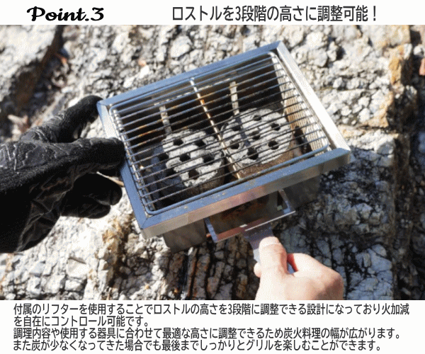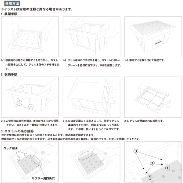 ![]() Mt.SUMI パーフェクトグリル ミニ SE OS25FWPG-MI-SE 焼き加減を調整できる!組立て・収納1秒の折りたたみ式グリル ![]() ![]() ![]() 【ご使用方法】 1.収納時の状態から専用アミを取りはずします。 2.ロストル部分を上にして両手はグリル本体の両側を握ります。 3.そのまま両サイドを自然に落下させ本体を展開します。 4.専用アミを取り付けて完成です。 ※ロストル・ボトムプレートが落下しない場合は軽くゆすってやるか手で押して下さい。 【長くお使いいただくために】 ・本製品は使用中の熱により変形する場合があります。 ・本体側面に燃えた燃料が触れるほどたくさんの燃料を入れると変形の要因となります。燃料を側面 から離すことで変形を軽減させることができます。 ・ロストルが大きく変形した場合は本体から取り外しハンマーなどで叩いて歪みを調整して下さい。 【FAQ】 Q.卓上で使用できますか? A.可能です。ただしスリットやロストルの穴から肉の油や小さい炭などが落ちる可能性があります ので耐熱シートやプレート等を敷いてご使用頂くと安心です。 Q.焼き網は交換できますか? A.可能です。別売にてご購入頂けます。 ![]() ![]() ![]() |