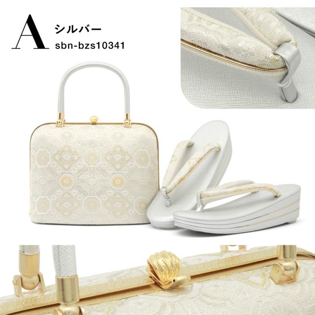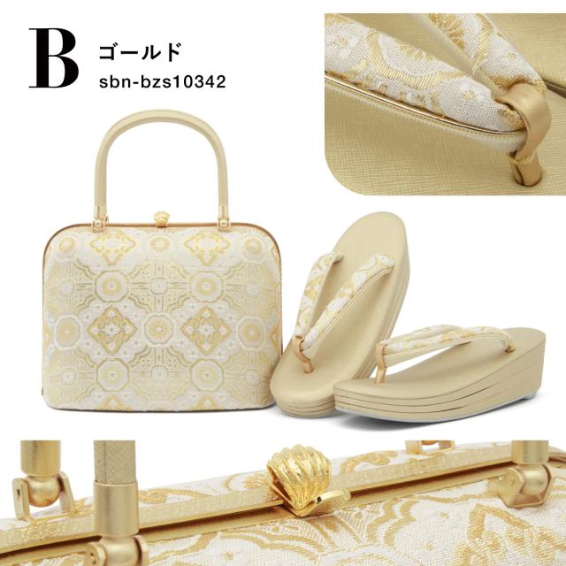 バッグと鼻緒には、輝く糸で蜀江をモチーフにした日本伝統の文様を織り込んだデザインで、フォーマルな場にふさわしい高級感を漂わせます。