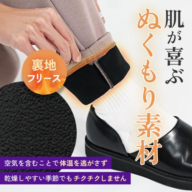 裏地にはふんわりと優しい肌ざわりのフリース素材を使用しており、快適な穿き心地と肌への負担の少なさを両立。