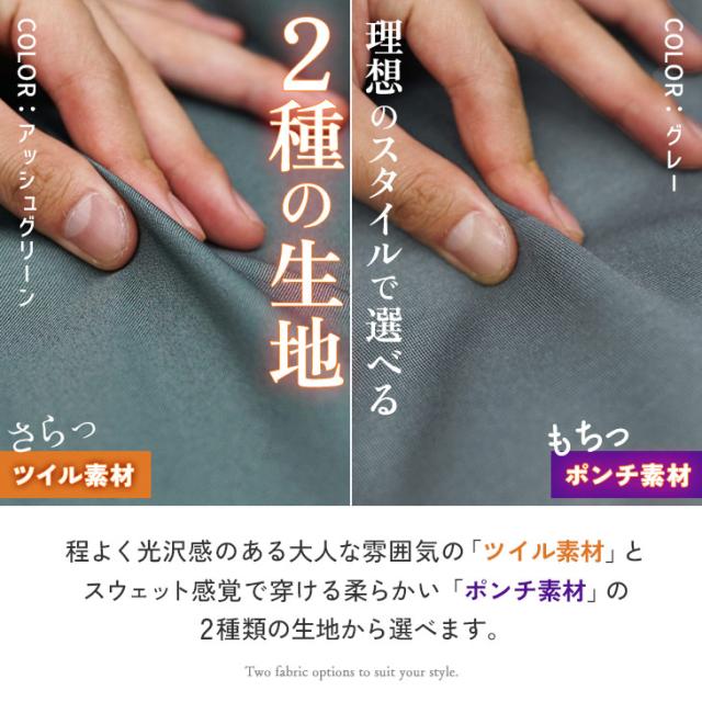 程よく光沢感があり、大人っぽいきれいめな印象に仕上がるツイル生地とラクな穿き心地でカジュアルに仕上がるポンチ素材の2種類から選べます。