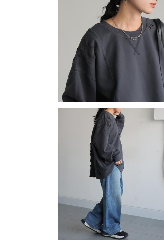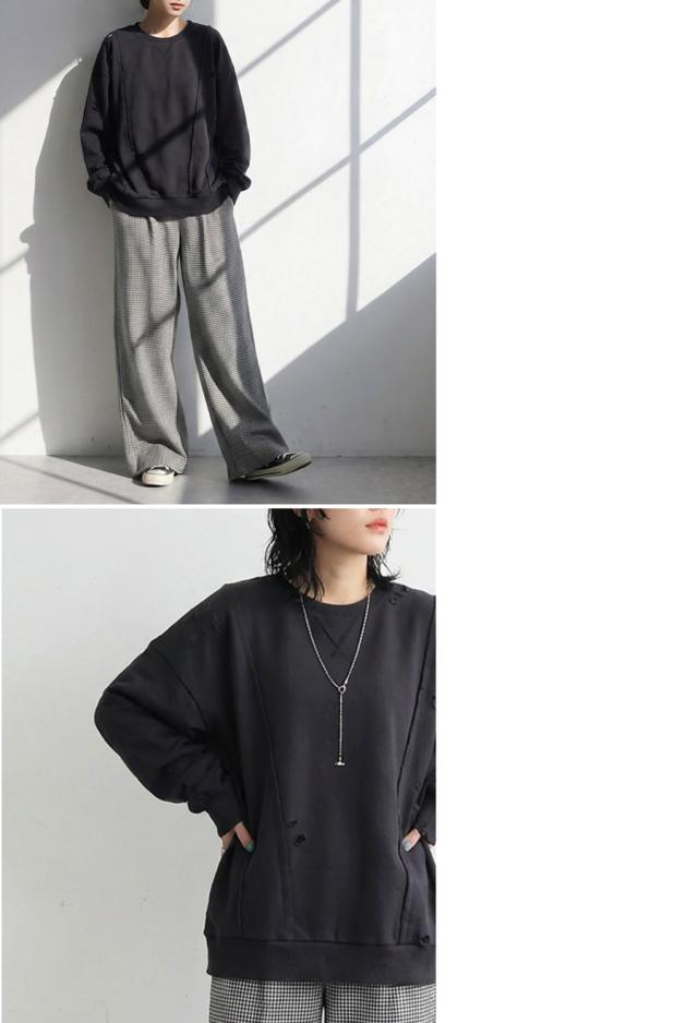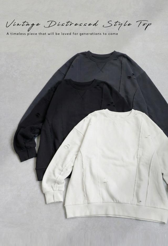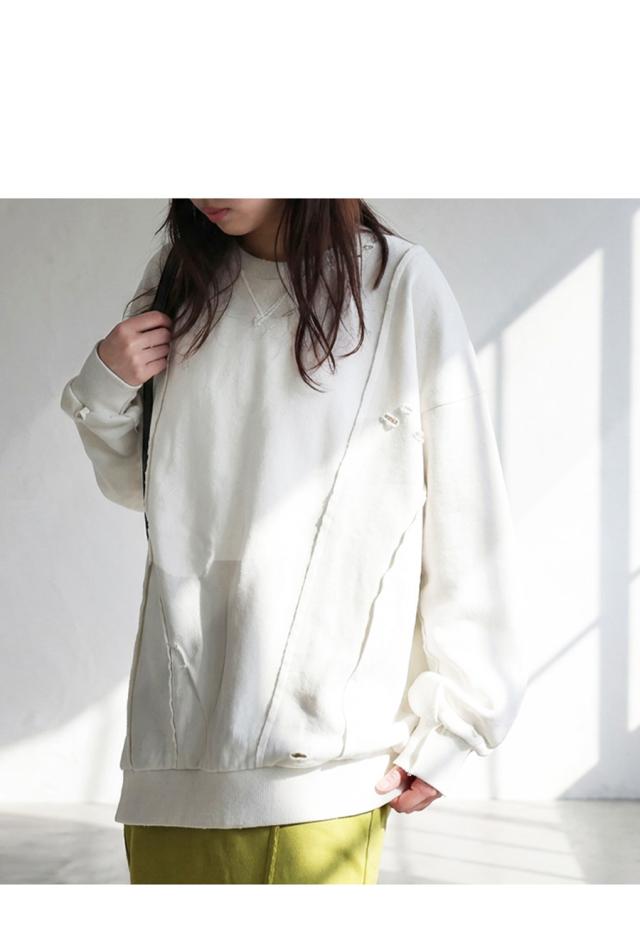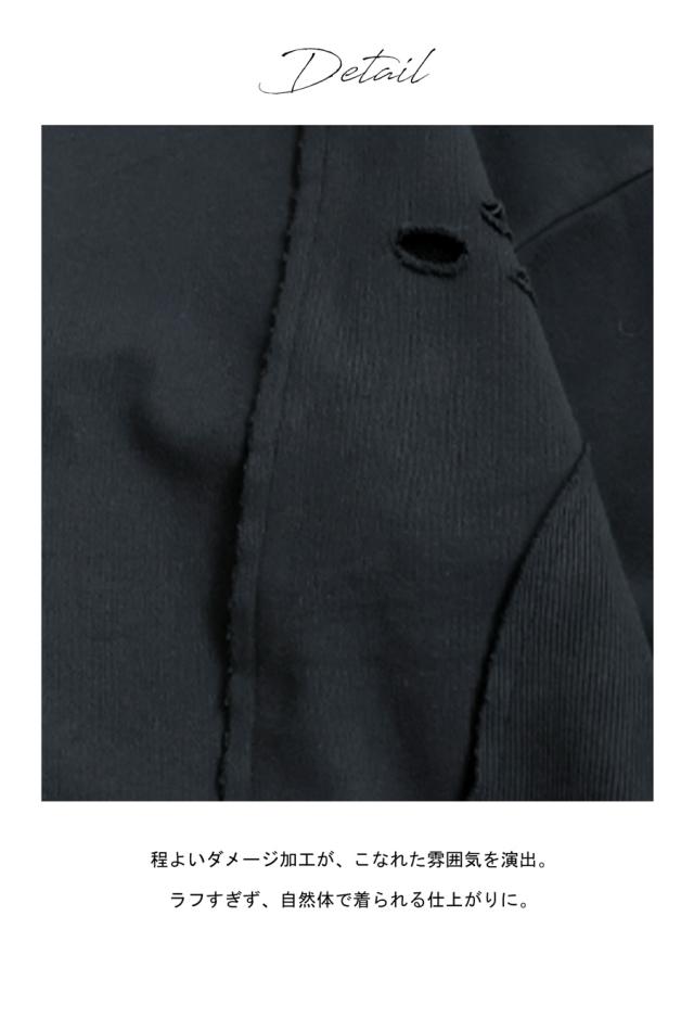 柄は無地、切り替えデザインとダメージ加工が特徴的な綿100%のコットン裏毛カットソーです。