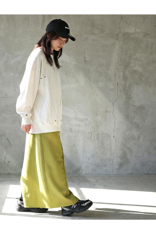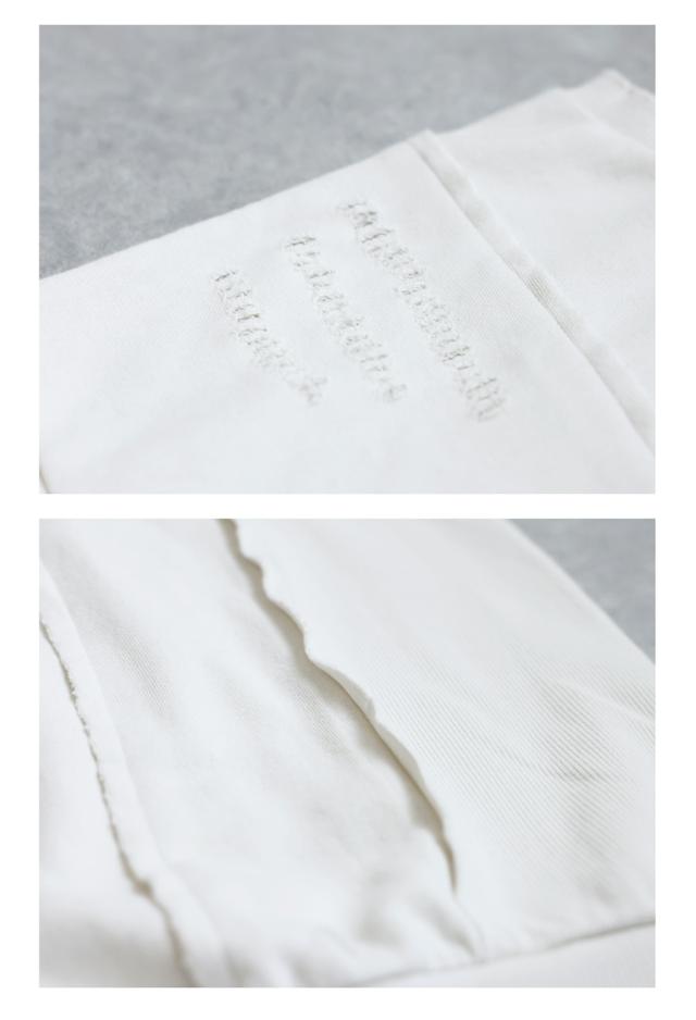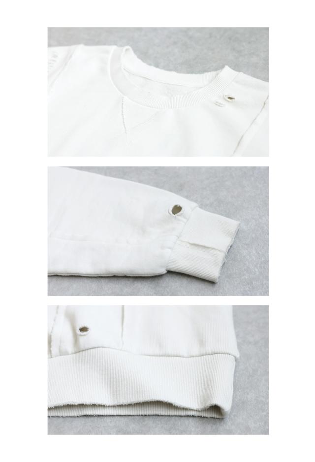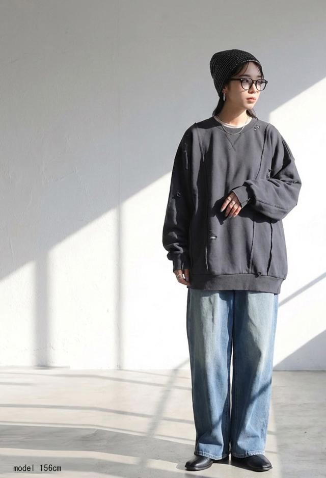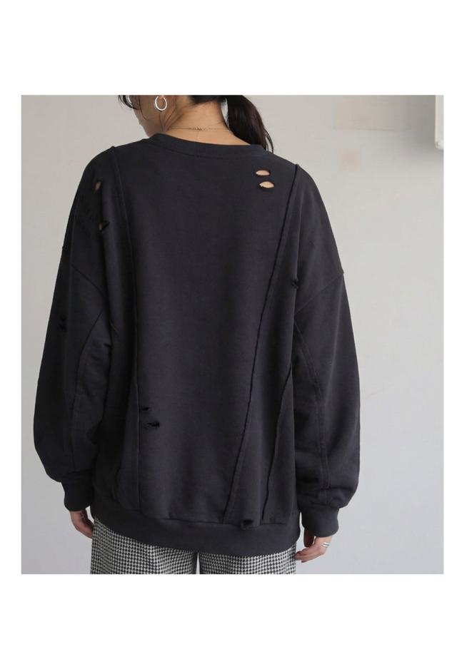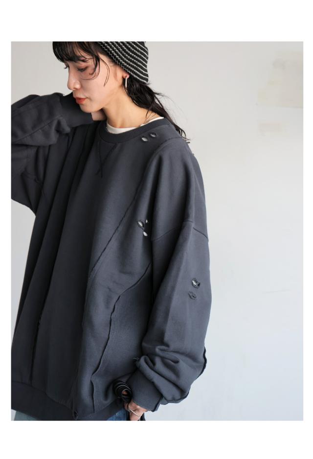 柄は無地、切り替えデザインとダメージ加工が特徴的な綿100%のコットン裏毛カットソーです。