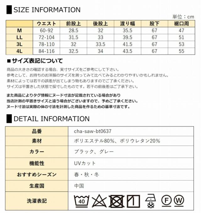 3L:ウエスト78-110 前股上32 後股上33.5 渡り幅41.5 股下67 裾口周53