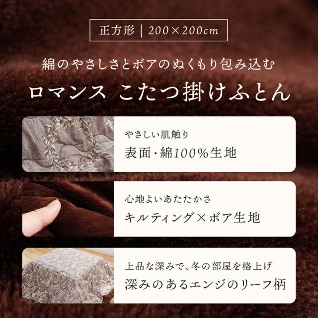 【半額!】ロマンス小杉 こたつ掛け布団 ボア 正方形 200×200 表生地綿100% こたつ布団 リーフ柄 ラゴム ROMANCE 在庫限り お得 ロマンス 高級感 ボア裏地 あったか リビング ダイニング おしゃれ 北欧風