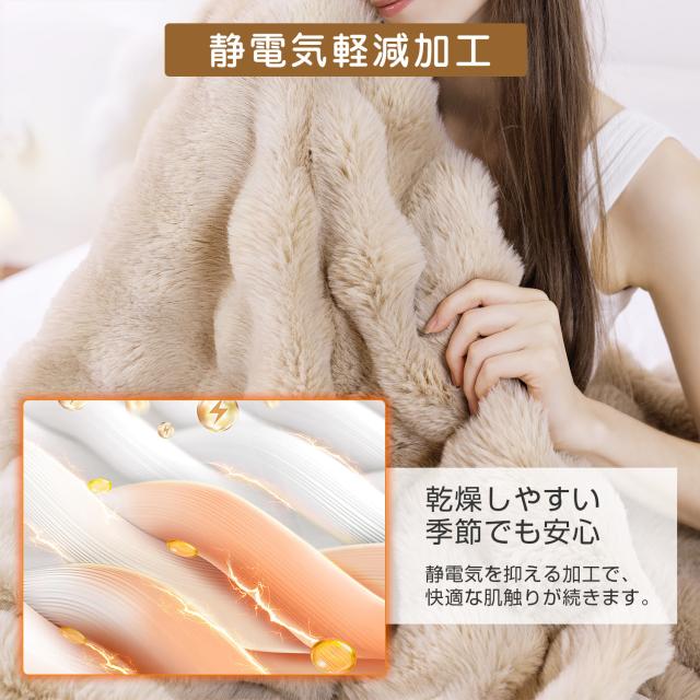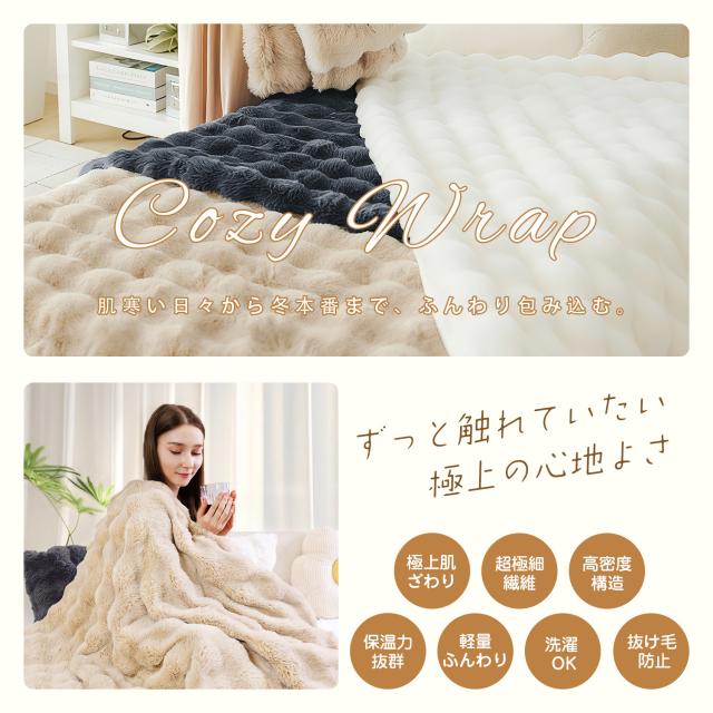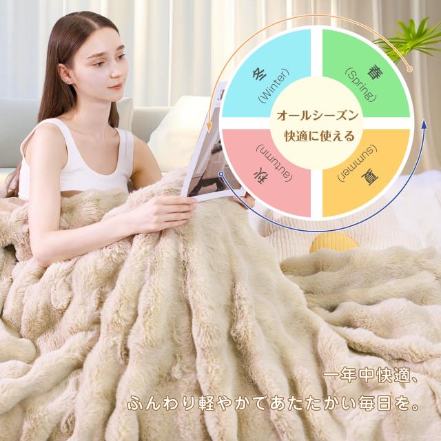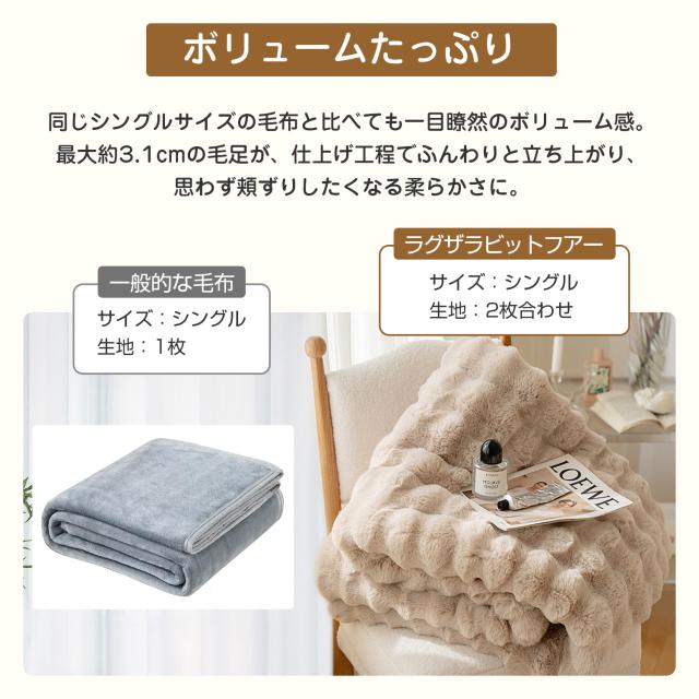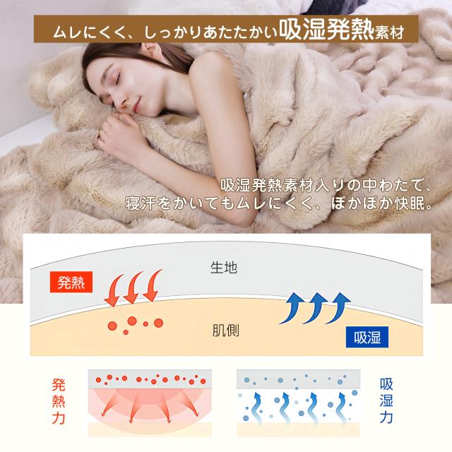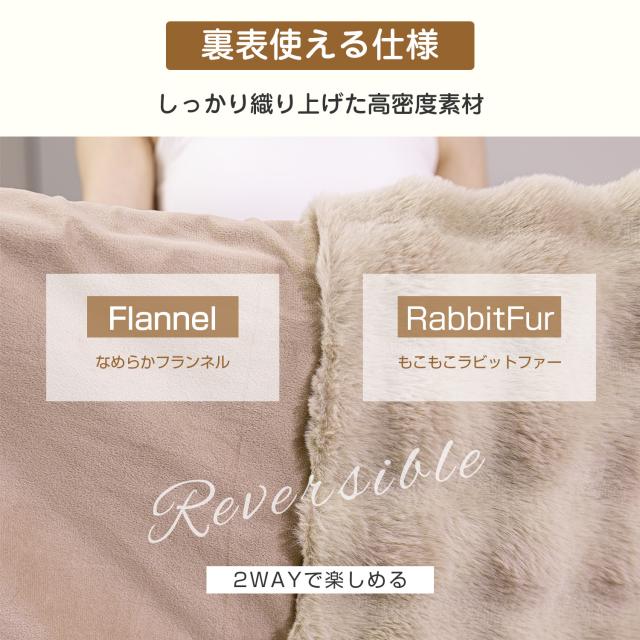 表面はもこもこラビットファー、裏面はなめらかフランネルを組み合わせた二重構造。超極細マイクロファイバーでシルクのような柔らかさを実現!空気をたっぷり含み、軽さと暖かさを両立。外側は寒さを防ぎ、内側は体温を閉じ込める高い保温力を発揮します。
