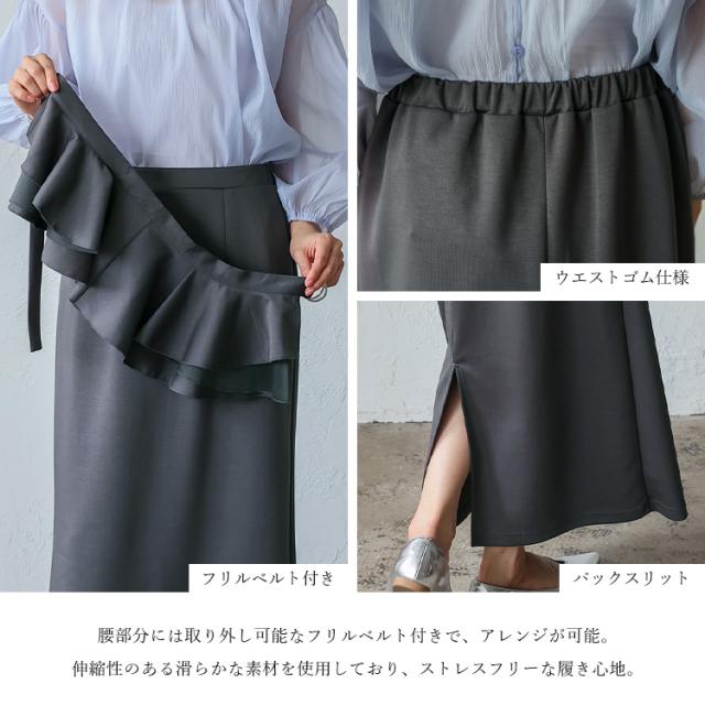 【セットアップ可】【フリルベルト付き】スカート ロング タイト ストレッチ ウエストゴム バックスリット マキシ丈 2way タイトスカート ナロースカート フリル おしゃれ 大人 カジュアル 高身長 blc-y93305