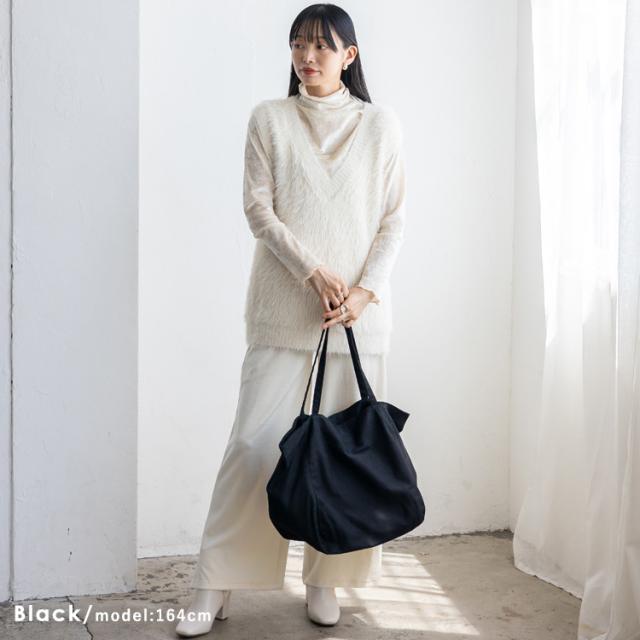 軽量で柔らかな素材が体に沿うようになじみ、大容量でも見た目はすっきり。