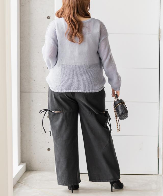 | 3Lを着てちょうどいいサイズでした。太ももにはゆとりがあって、スリットの隙間から肌がちらっと見えるデザイン。カジュアルな素材とシルエットだけど、肌見せもあって女性らしさたっぷりです。ウエストやヒップもすっきり細見えします!着心地も楽ちんで、楽におしゃれしたい方にもおすすめ!可愛いデザインのデニムパンツはレアなので、ボトム選びに悩んでる方にお勧めしたい1枚です♪ |