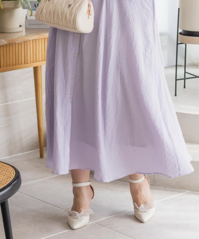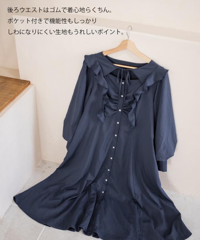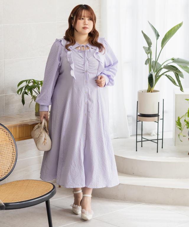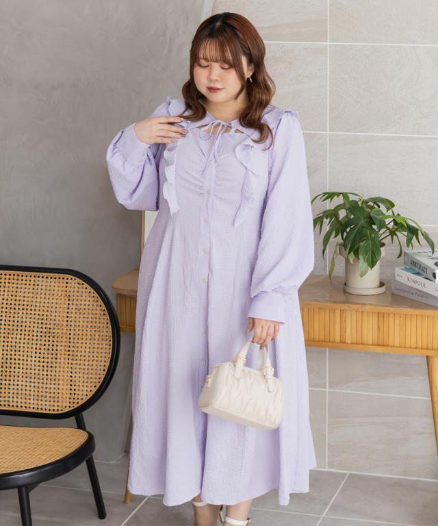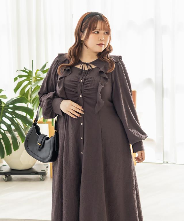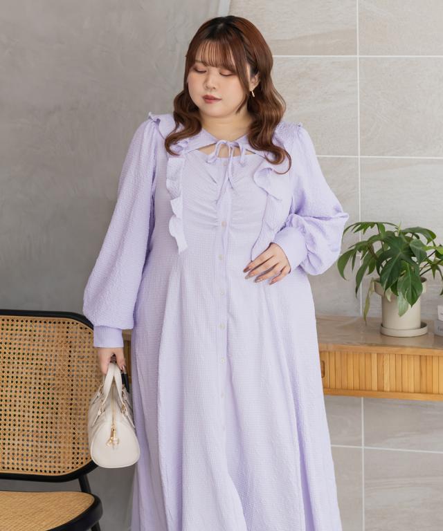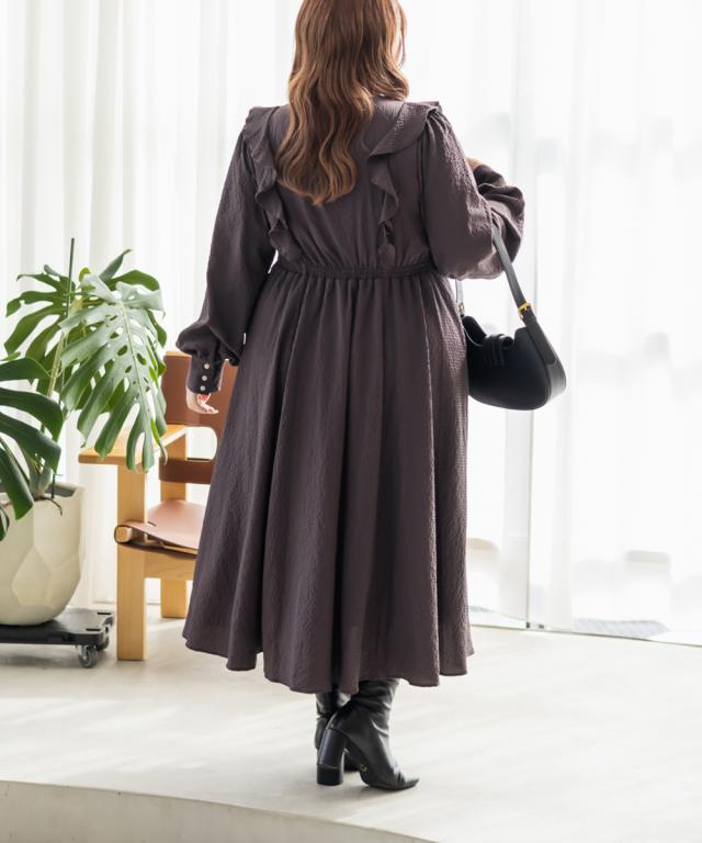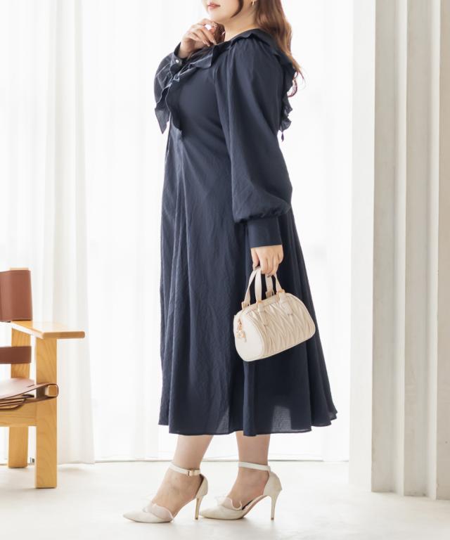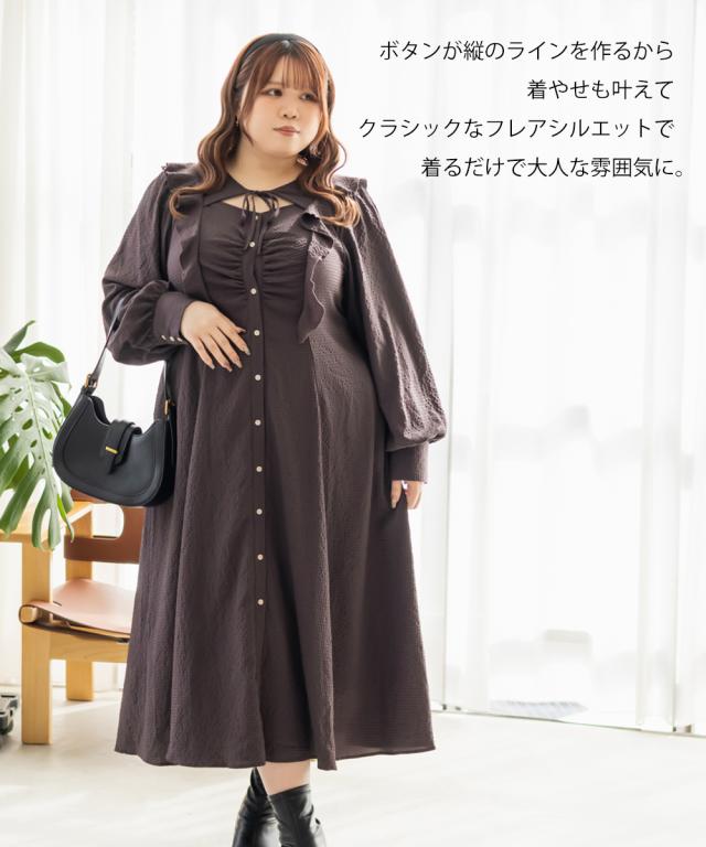 | 3Lサイズを着用してちょうどいいサイズ感でした。くびれて見えるデザインでメリハリのある女性らしい印象です。凹凸のある生地は軽く柔らかいのにボディラインを拾いずらく、すっきりした印象で着やせも抜群です。デコルテのデザインとフリルがガーリーな雰囲気でネックレスいらずなのも嬉しい!袖もふんわりして二の腕カバーもバッチリです!デートやお出かけに着ていきたくなる1枚で着映えするワンピースです♪ |