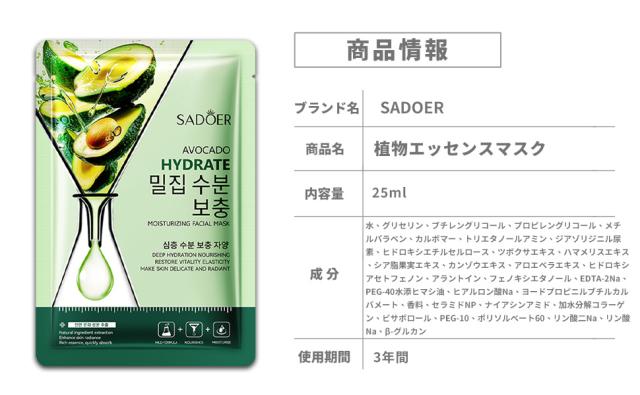 [10枚セット]天然フルーツエッセンス シートマスク 個包装、フェイスパック 大容量【アボカドエキスアンプル】活性成分配合、鎮静パック、ビタミン パック、美容パック、デイリーパック、ピタッと密着、肌荒れ パック、美容マスク