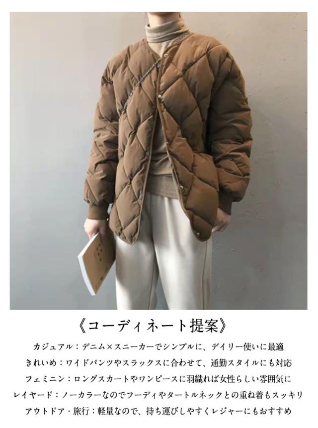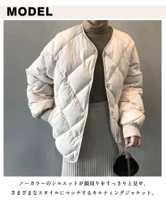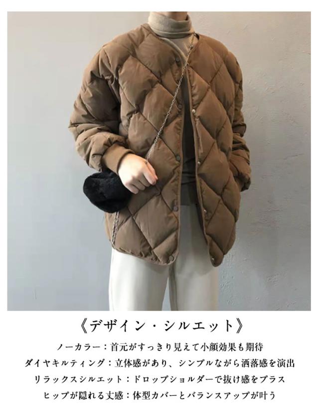 | ノーカラーキルティングジャケット S−2XL 3color ノーカラーのシルエットが顔周りをすっきりと見せ、 さまざまなスタイルにマッチするキルティングジャケット。 中綿が入っているので保温性があり、軽い着心地なのも魅力的です。 定番アイテムだからこそ、シンプルかつこだわりのディテールで 日常に馴染みやすく、コーディネートしやすいデザインにまとめました。 秋のアウターとしてはもちろん、冬にはコートのインナーとしても 大活躍してくれそうな着回し力抜群のアイテムです。 《商品ポイント》 ノーカラー仕様でマフラーやハイネックとも相性抜群 軽量で着心地ラクラク、持ち運びにも便利 程よいゆとりがあり、重ね着してもごわつかない ダイヤ柄のキルティングが高見え効果をプラス カラー展開で着回し力◎ 《デザイン・シルエット》 ノーカラー:首元がすっきり見えて小顔効果も期待 ダイヤキルティング:立体感があり、シンプルながら洒落感を演出 リラックスシルエット:ドロップショルダーで抜け感をプラス ヒップが隠れる丈感:体型カバーとバランスアップが叶う 《コーディネート提案》 カジュアル:デニム×スニーカーでシンプルに、デイリー使いに最適 きれいめ:ワイドパンツやスラックスに合わせて、通勤スタイルにも対応 フェミニン:ロングスカートやワンピースに羽織れば女性らしい雰囲気に レイヤード:ノーカラーなのでフーディやタートルネックとの重ね着もスッキリ アウトドア・旅行:軽量なので、持ち運びしやすくレジャーにもおすすめ | |