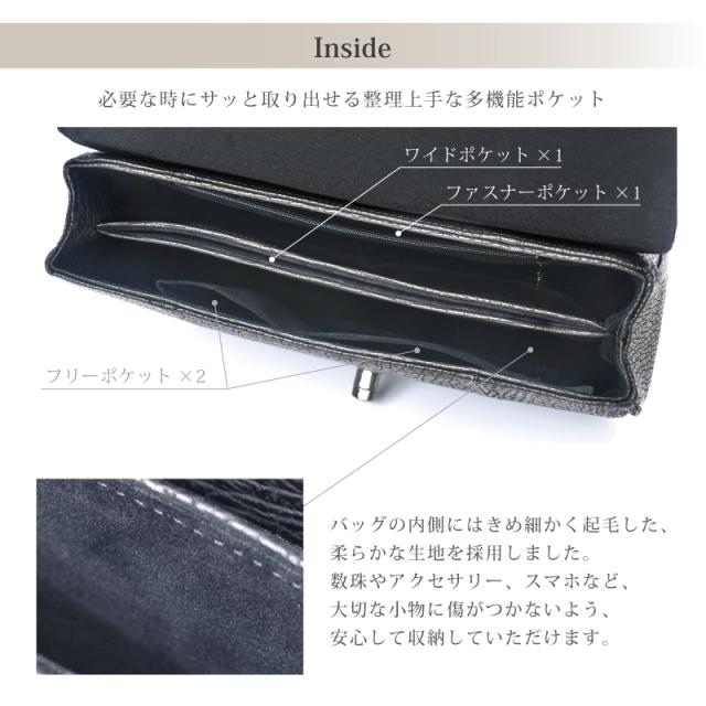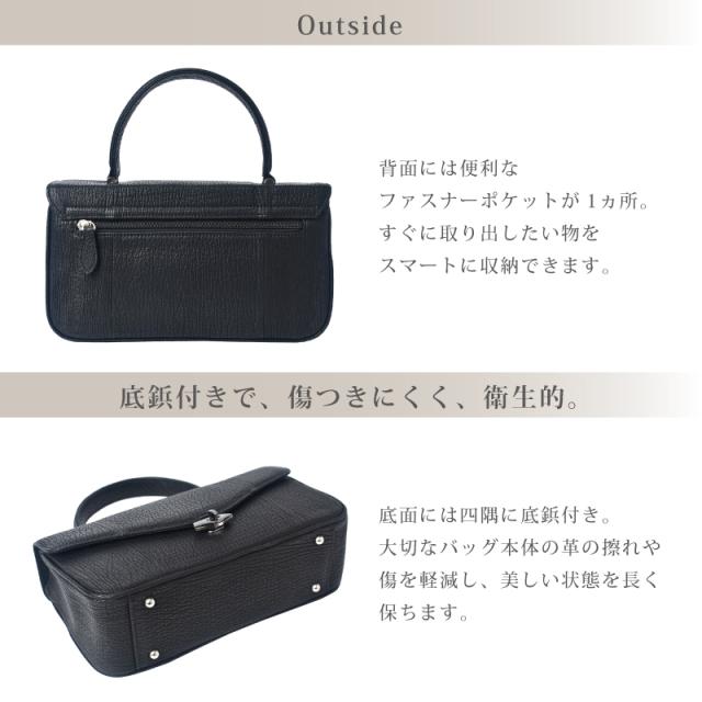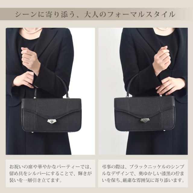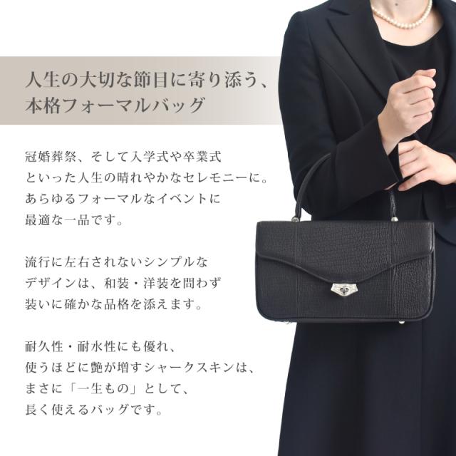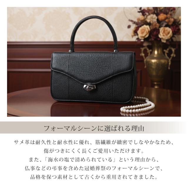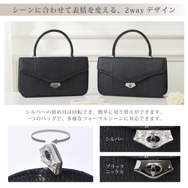 | 品名 | フォーマルバッグ 2way シャークレザー レディース 日本製 国産 女性 シャークスキン 気仙沼 鮫革 本物 ハンドバッグ 慶弔両用 黒 ブラック 冠婚葬祭 高級 入学式 卒業式 結婚式 セレモニー バッグ |