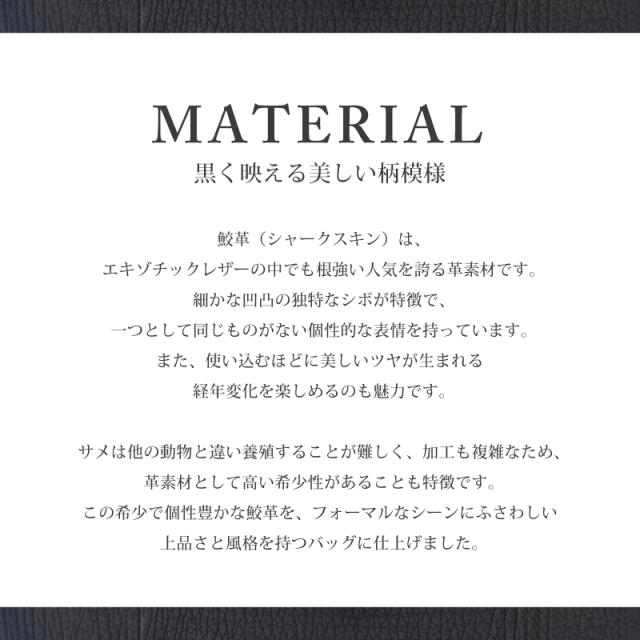 人生の大切な節目に寄り添う、本格フォーマルバッグ。 冠婚葬祭、そして入学式や卒業式といった人生の晴れやかなセレモニーに。 あらゆるフォーマルなイベントに最適な一品です。 流行に左右されないシンプルなデザインは、和装・洋装を問わず装いに確かな品格を添えます。 耐久性・耐水性にも優れ、使うほどに艶が増すシャークスキンは、まさに「一生もの」として、長く使えるバッグです。 【水揚げから創り上げる、純国産シャークスキン】 日本近海の太平洋で捕獲され気仙沼港で水揚げされた「吉切鮫/ヨシキリザメ(Blue shark)」を日本の特殊な鞣し技術と、経験による高度な技で仕上げた純国産の最高級シャークスキンです。 【MATERIAL 黒く映える美しい柄模様】 鮫革(シャークスキン)は、 エキゾチックレザーの中でも根強い人気を誇る革素材です。 細かな凹凸の独特なシボが特徴で、一つとして同じものがない個性的な表情を持っています。 また、使い込むほどに美しいツヤが生まれる経年変化を楽しめるのも魅力です。 サメは他の動物と違い養殖することが難しく、加工も複雑なため、革素材として高い希少性があることも特徴です。 この希少で個性豊かな鮫革を、フォーマルなシーンにふさわしい上品さと風格を持つバッグに仕上げました。 【シーンに合わせて表情を変える、2wayデザイン】 シルバーの留め具は回転でき、簡単に切り替えができます。一つのバッグで、多様なフォーマルシーンに対応できます。 【シーンに寄り添う、大人のフォーマルスタイル】 お祝いの席や華やかなパーティーでは、留め具をシルバーにすることで、輝きが装いを一層引き立てます。 弔事の際は、ブラックニッケルのシンプルなデザインで、奥ゆかしい漆黒の佇まいを保ち、厳粛な雰囲気に寄り添います。 【メイドインジャパンの証、信頼のJRAタグ。】 JRAマークが証明する、本物の美しさ。 このバッグに付いているJRAマークは、ワシントン条約に基づき正規に輸入されたものを使用し、日本国内で製造された高品質な製品であることの証です。 このマークがあることで、安心と信頼の「ジャパンブランド」であることを示しています。 【ヨシキリザメの生産量日本一 気仙沼産SHARK SKIN(鮫革)】 気仙沼では全国で食用ヨシキリザメの漁獲量一位を誇っております。 大型の品種よりもキメが細やかで、柄模様の美しさに特徴があります。 水揚げ後、身はフカヒレをはじめとする加工食品やサプリメントへ、残った皮は財布やバッグなどの革小物へと無駄なく利用されています。 【フォーマルシーンに選ばれる理由】 サメ革は耐久性と耐水性に優れ、筋繊維が緻密でしなやかなため、傷がつきにくく長くご愛用いただけます。 また、「海水の塩で清められている」という理由から、仏事などの弔事を含めた冠婚葬祭のフォーマルシーンで、品格を保つ素材として古くから重用されてきました。 【バッグ内側】 必要な時にサッと取り出せる整理上手な多機能ポケット。 ファスナーポケット1ヵ所…貴重品やアクセサリーなどに。 フリーポケット2ヵ所…スマホやハンカチなどの収納に。 ワイドポケット1ヵ所…数珠や招待状などの収納に。 バッグの内側にはきめ細かく起毛した、柔らかな生地を採用しました。 数珠やアクセサリー、スマホなど、大切な小物に傷がつかないよう、安心して収納していただけます。 【バッグ外側】 背面には便利なファスナーポケットが1ヵ所。すぐに取り出したい物をスマートに収納できます。 底面には四隅に底鋲付き。大切なバッグ本体の革の擦れや傷を軽減し、美しい状態を長く保ちます。 【カジュアルな装いにも合わせやすい】 フォーマルなシーンはもちろん、日常のきれいめスタイルにも自然に馴染む、ハンドバッグ。 品の良さを保ちつつ、かしこまりすぎないシンプルなフォルムとデザインは、オフィスやお食事会などにも最適。 |
