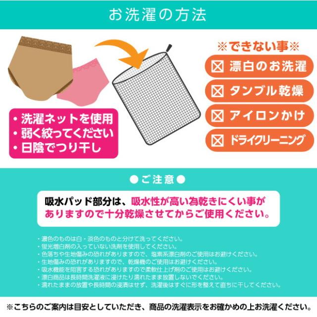 | 備考 | ※画面上と実物では、お客様のパソコンの環境・また撮影時の環境等により多少色目が異なって見える場合もございます。 ご理解ご了承の程お願い申し上げます。 ※ご使用上の注意をよく読んで御利用下さい。 ※本品はおむつではなく下着です。 吸水性能は一度に吸収するものではなく、軽度の失禁数回程度の漏れに対応した商品となっております。 身体の動きや姿勢、水分量等により漏れる場合がありますのでご注意ください。 ※【吸水性(尿の吸水性)について】 ○加圧試験 新品時の失禁パンツ(股部分)またはパッドに※人工尿を5ml滴下しては1分間放置し、滴下部にアクリル版、重りの順にのせ、1分間50g/㎤の荷物を掛けることを繰り返し、もれ出るまでに滴下した量を求めた。 ※人工尿:0.9%食塩水1リットルに、尿素21gが溶解しているもの ○滴下試験 製品のパッドマチ中央に5mlずつ滴下し、身生地への染み出しを調べた。(パイピング、縫い目からの染み出しも含む) 【動画について】 ※動画使用のパッドは商品によって異なるので、それぞれの商品説明文をご確認くださいませ。 ※薄型パッドとしての機能は一緒です。 |