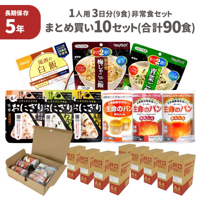 非常食セット 10セット ( 90食 ) 1人用 3日分 9食 5年保存 まとめ買い 保存食 防災食 非常用食品 ご飯 お米 アルファ米 パン おにぎり A4サイズ 5年 PEACEUP