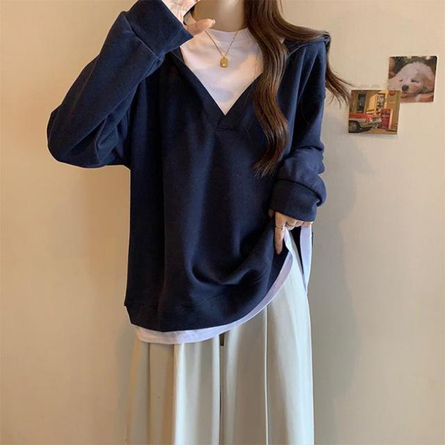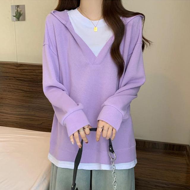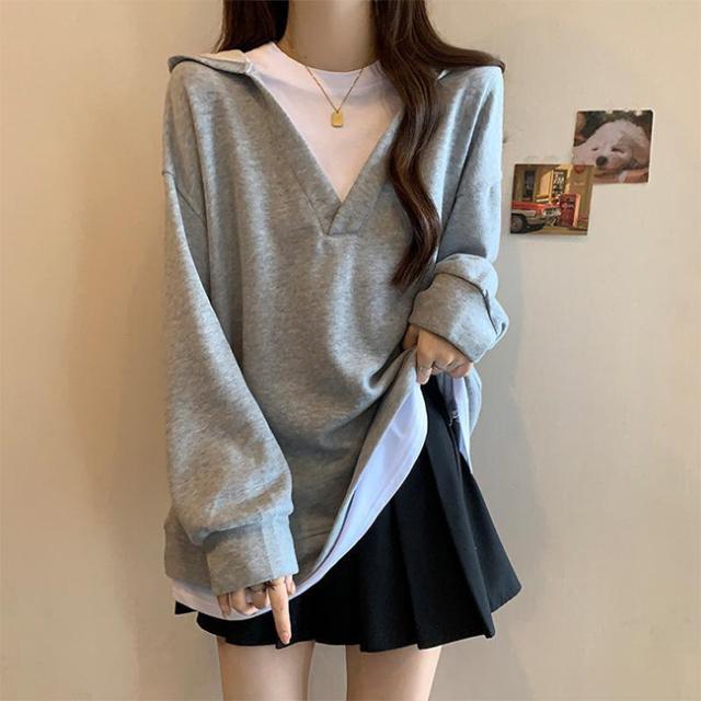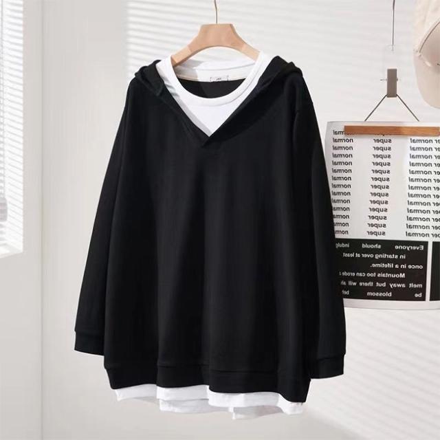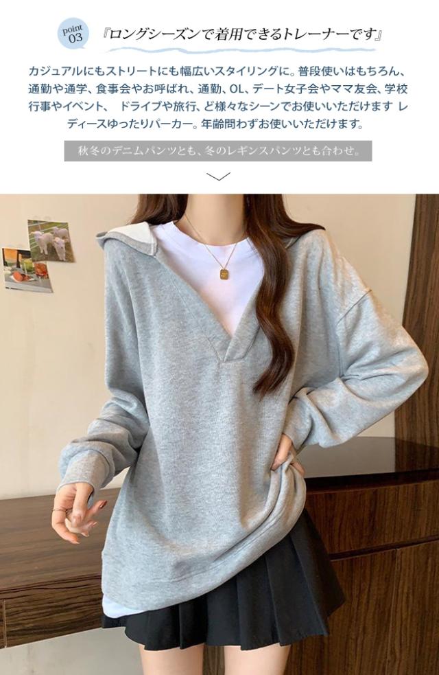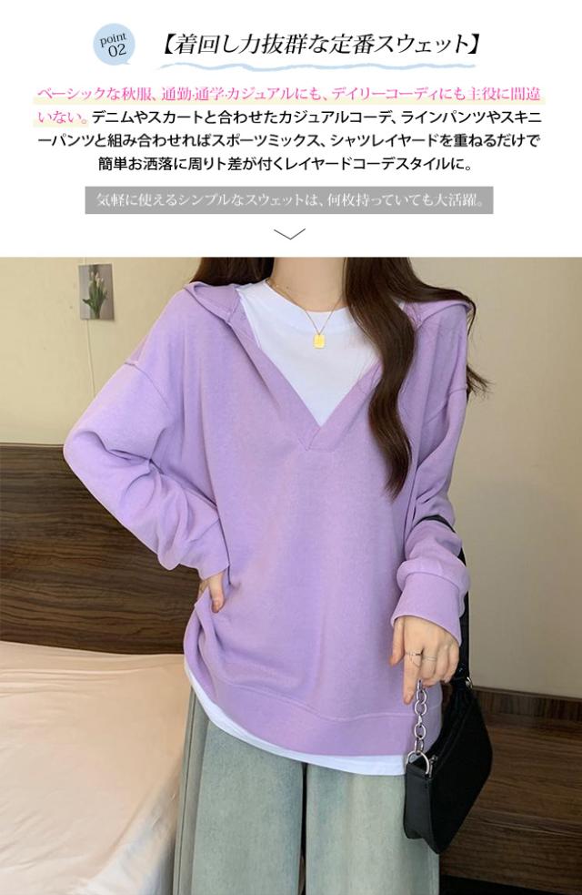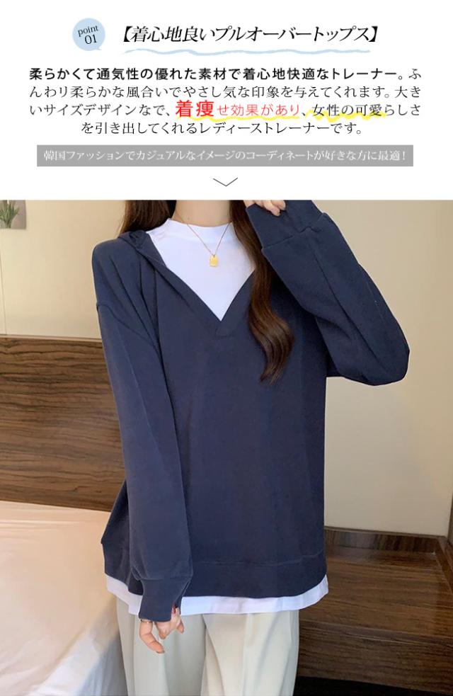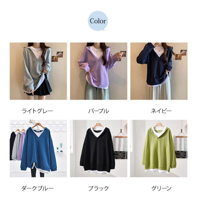 パーカー レディース トレーナー スウェット 長袖 切り替え 重ね着風 トップス ゆったり フード付き シンプル 韓国 体型カバー 無地 着痩せ 通勤 春 秋 冬