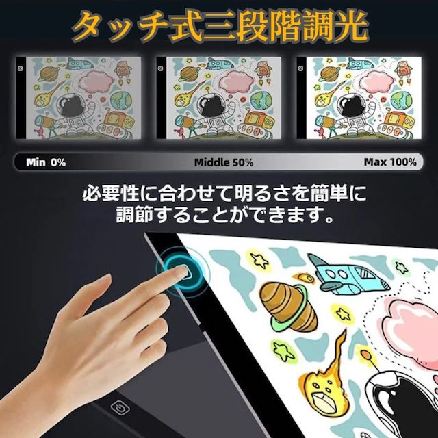 タッチセンサー方式、3段階の調光機能を搭載。高い均一性の光、ちらつきなし、目の疲労が軽減できます。使用環境によっておす好みの明るさに調整が可能です。ボタン部分が平らに設計されていますので、トレースのときに邪魔になりません。3つの明るさのレベルはあなたの好みの明るさに合うように調節可能です。 ちらつきのないLED電球を内蔵しているので、完璧な照明、超高輝度、ちらつきがありません。