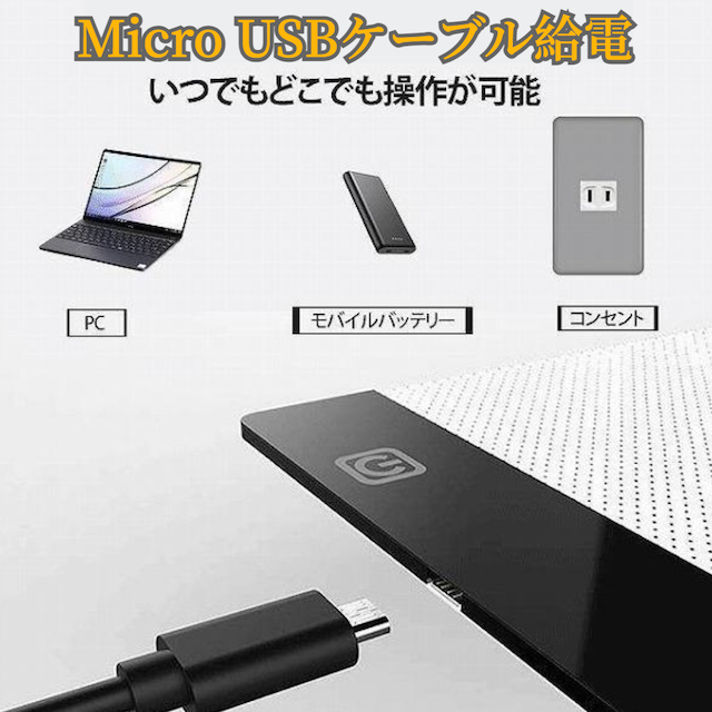A4サイズのトレース台はとてもスリムです。厚さは4mm以内にコントロールしております。薄くて軽く、収納、片付け・持ち運びにも便利です。Micro USBケーブル付きますので、収納簡単、携帯便利で、場所を選ばずにモバイルバッテリー、パソコンなどに挿すだけで上手く充電が出来ていただけます。