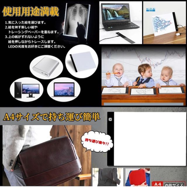 A4サイズはとても便利で、収納しやすい、携帯性があります。厚みは3.5mmだけで、 iPadより薄い、バッグに入れてもいい、収納しやすい、携帯性があります。トレース台の本体は500gだけで、薄くて軽く、カバン、本棚、引き出しに入れるのは問題はありません。だから、自宅に限らず、出張、オフィス、車に乗る時どこでも利用可能です。