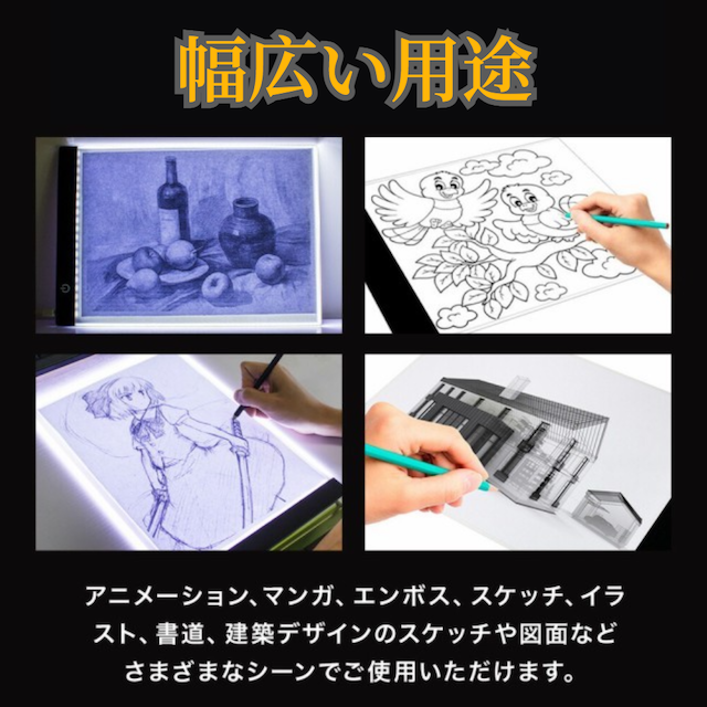 アニメ、マンガ、エンボス、スケッチ、フィルム、イラストレーション、レントゲン、入れ墨、書道、手芸、写経、測量、建築設計スケッチ&図面、DIY手作りなどいろいろ楽しめます。プロ絵師、デザイナー、芸術家、大学生、子供などで楽々に適用します。