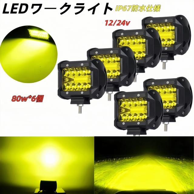 12V 24V ワークライト led 作業灯 フォグランプ ダンプ トラック スポットライト 投光器 80w 6個 黄イエロー補助灯 車幅灯 ジムニー 照明