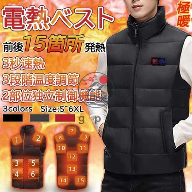 電熱ベスト 男女兼用 日本製ヒーター 水洗い可能 3段階調温 超軽量 15箇所発熱 ワークマン バッテリー 速暖 USB給電式秋冬用 加熱ベスト 暖房服 防寒着 防寒対策
