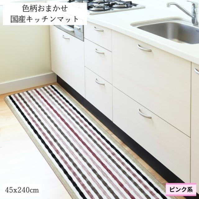 色柄おまかせ国産キッチンマット ピンク系 45x240cm 丸洗いOK 滑り止め加工 日本製