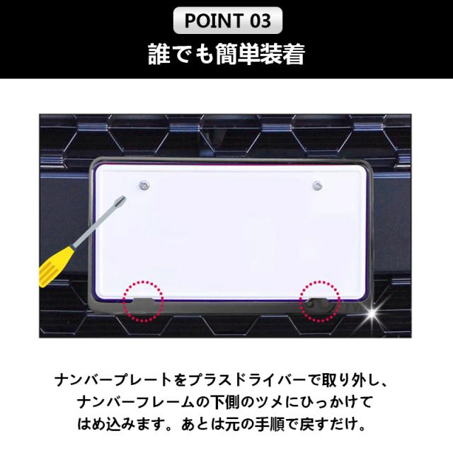 ナンバープレートをプラスドライバーで取り外し、ナンバーフレームの下側のツメにひっかけてはめ込みます。