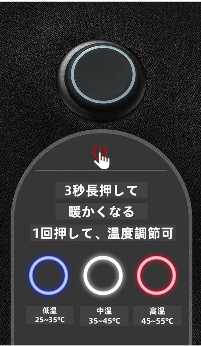 3、この間ボタンを押す度に赤(高温)、白(中温)、青(低温)へと切り替わります。予熱中ボタンを押し、温度を切り替えしないと、ベストは自動的電源OFFとなります。