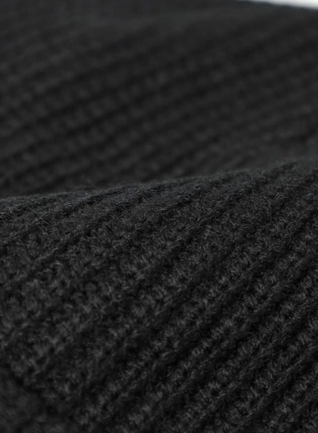 バルキーな編み地による存在感と、フロントに配したマウンテンロゴの織りネームがデザインのポイント。