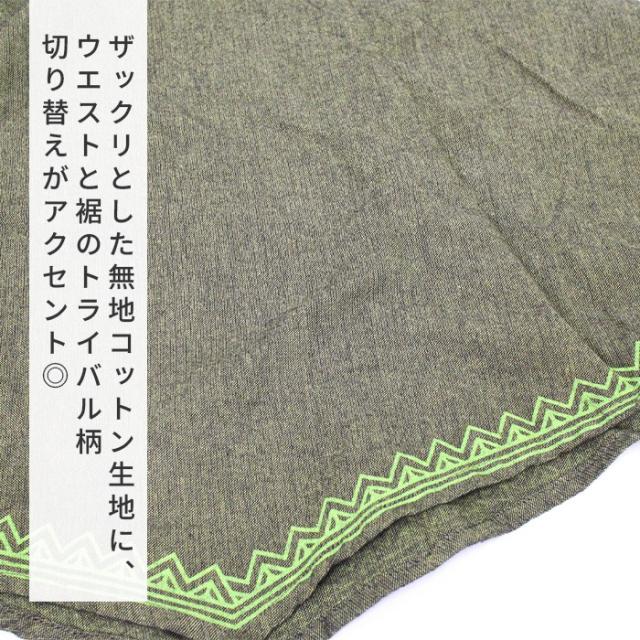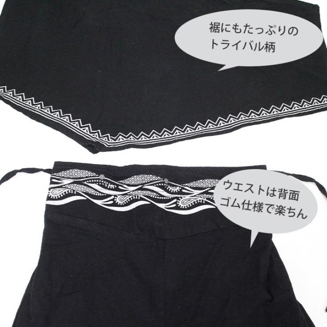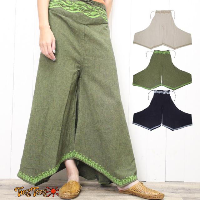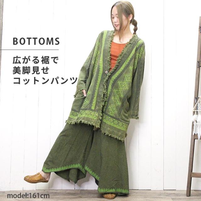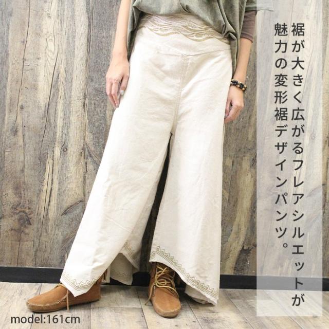 フレアパンツ コットン 変形裾 トライバル柄 ゆったり ロング丈 ボヘミアン エスニック 【SPT】ボヘミアン調変形フレアパンツ レディース ウエストゴム ポケット付き 30代 40代 50代