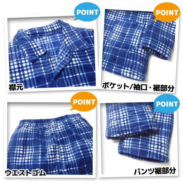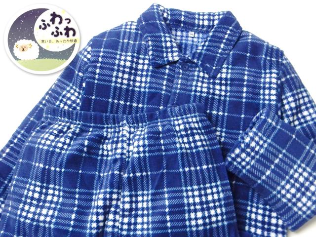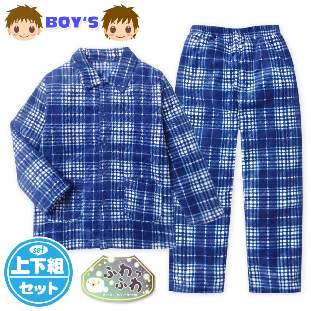 【送料無料】男児 キッズ ジュニア サンゴフリース素材 長袖 パジャマ 前開き 上下組 あったか素材 保温 ふわふわ チェック柄 130cm 140cm 150cm 160cm yg-3155b-bl【メール便対応】