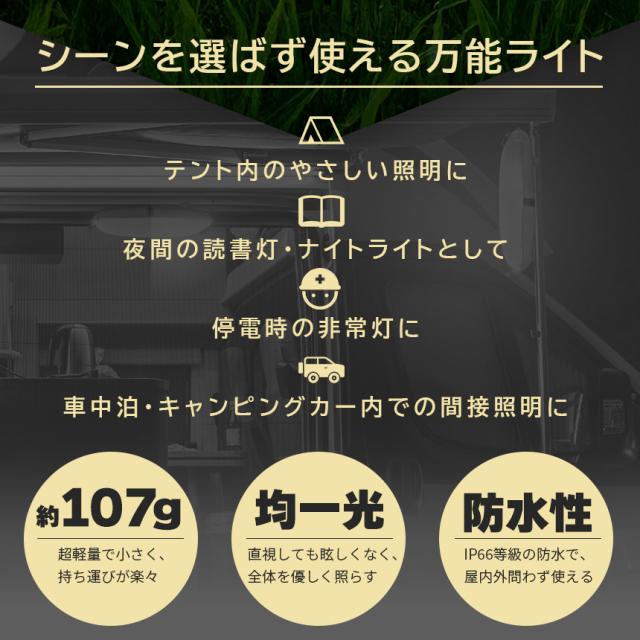 ・IP66の防水設計だから、雨天時や湿気の多い場所でも安心。キャンプ、登山、夜釣り、フェスなど、屋外シーンでも頼れる光源として活躍します。災害時や停電時の非常灯としても心強い存在です。