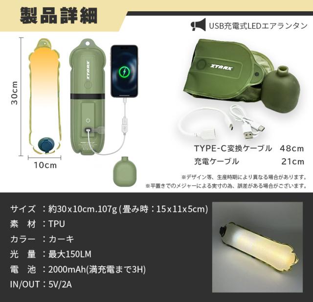 キャンピングライト エアライト LEDランタン LEDライト キャンプ ライト 充電式 2000mAh 多機能 キャンプランタン 多機能照明 アウトドアライト 折り畳み 防災 調光 多用途 軽量 寝室 オフィス 登山 キャンピングカー お祭り 夜釣り 夜間作業