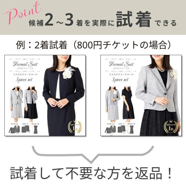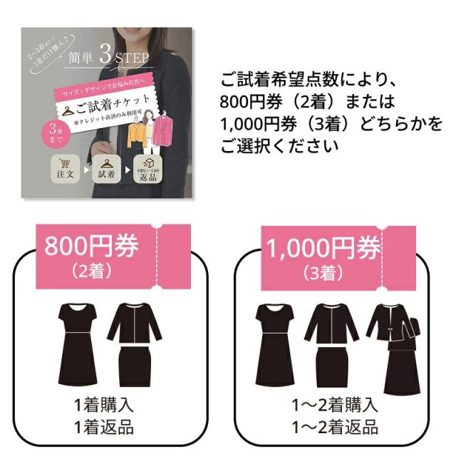 試着チケット サイズ・色・デザインでお悩みの方 最大3着まで試着可 5日間自宅で試着できる便利チケット 交換するより安い早い ママスーツ ブラックフォーマル シニア向けスーツ 七五三 卒業式 入学式 結婚式 七五三 試着チケット