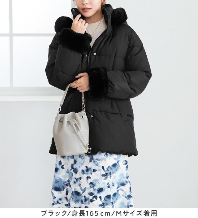・フードと袖口にあしらったフェイクファーが顔まわりと手元を華やかに演出し、冬の装いに女性らしさをプラスします。