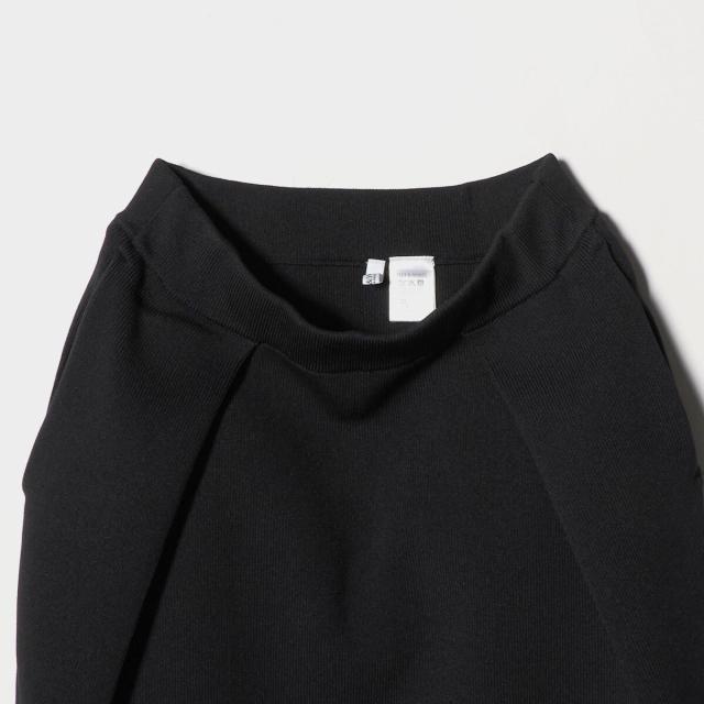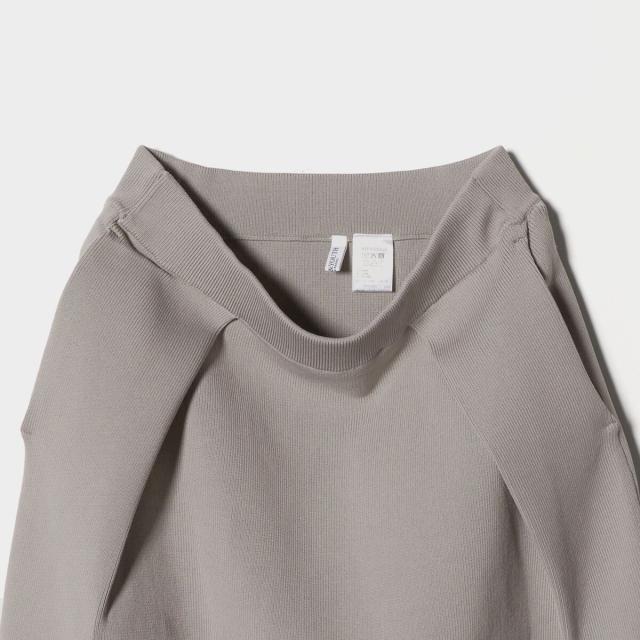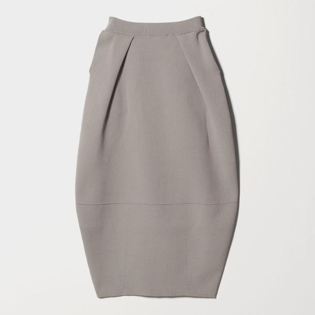 上品な光沢とハリ感を持つプレーティングニットで仕立てた、コクーンシルエットスカート。