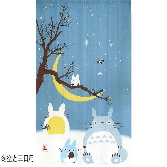 穏やかな冬空と三日月を背景にしたトトロのデザインが心を癒す一枚。静かな季節にぴったりの大人かわいいのれんです。