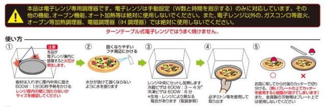 | 使い方 注意:本品が電子レンジ庫内に接触すると火花が発生します 1.食材は入れずに庫内中央に置き600W:1分30秒予熱をかける (レンジ庫内の壁に当たらないかサイズを確認してください) 2.水分が抜けて固くならないように水を振ります (固くなりやすいフチ周辺にかける) 3.レンジ中央にセットし加熱します。冷蔵ピザは600W:3〜4分、冷凍ピザは600W:6分 (生地?レンジにより異なる場合があります(取説参照)) 4.必ずミトン等を使用して取り出す 5.お皿に移してから付属のカッターで切り分ける。 (熱いプレートの上でカッターを使用すると樹脂が溶けてしまいます) また、金属製の刃物等はプレート上では使用しないでください 自家製ピザの調理は推奨しておりません。自家製ピザについての問い合わせにはお答えできませんのでご了承ください。 |